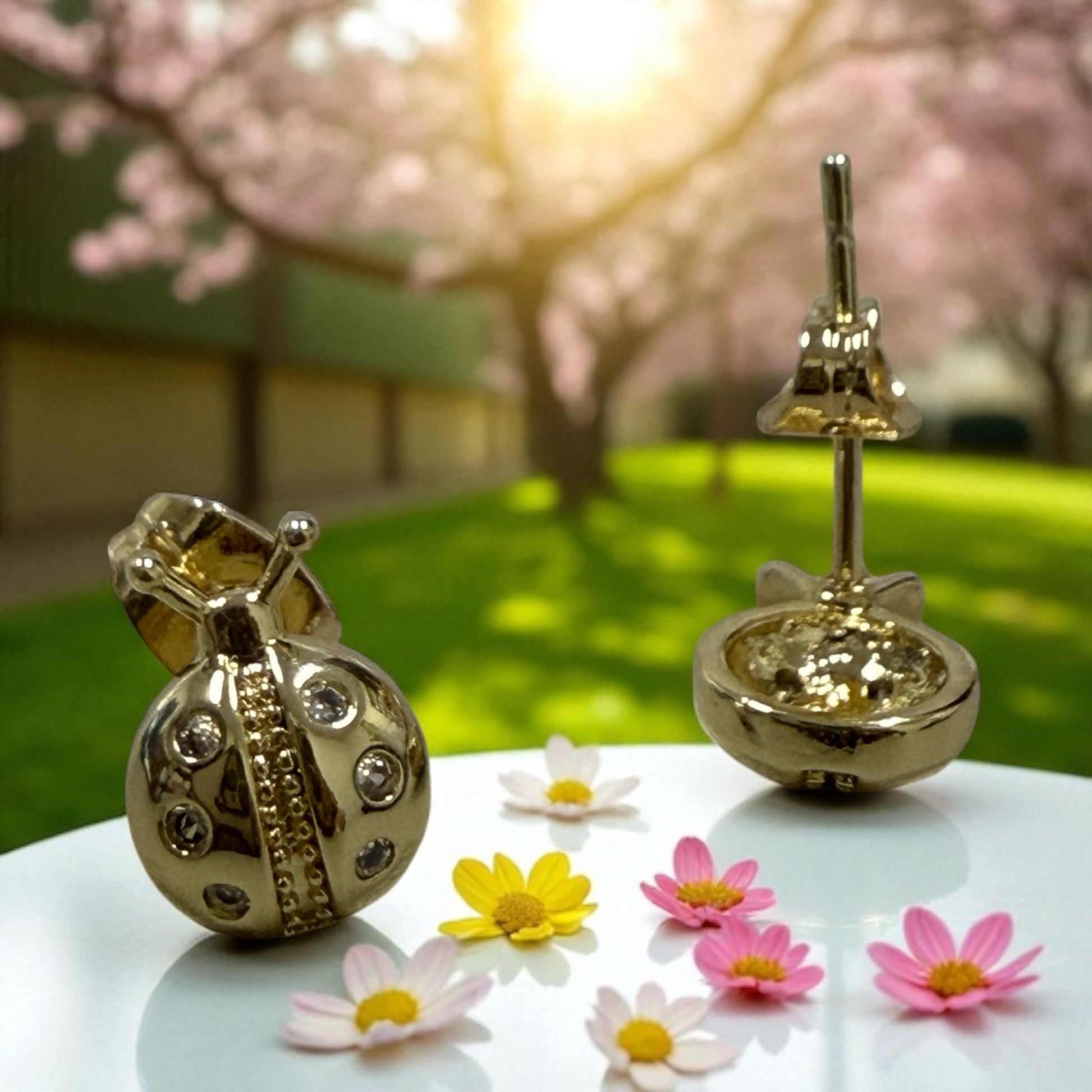Lady bug with cz stones 14k gold electroplated post back earrings