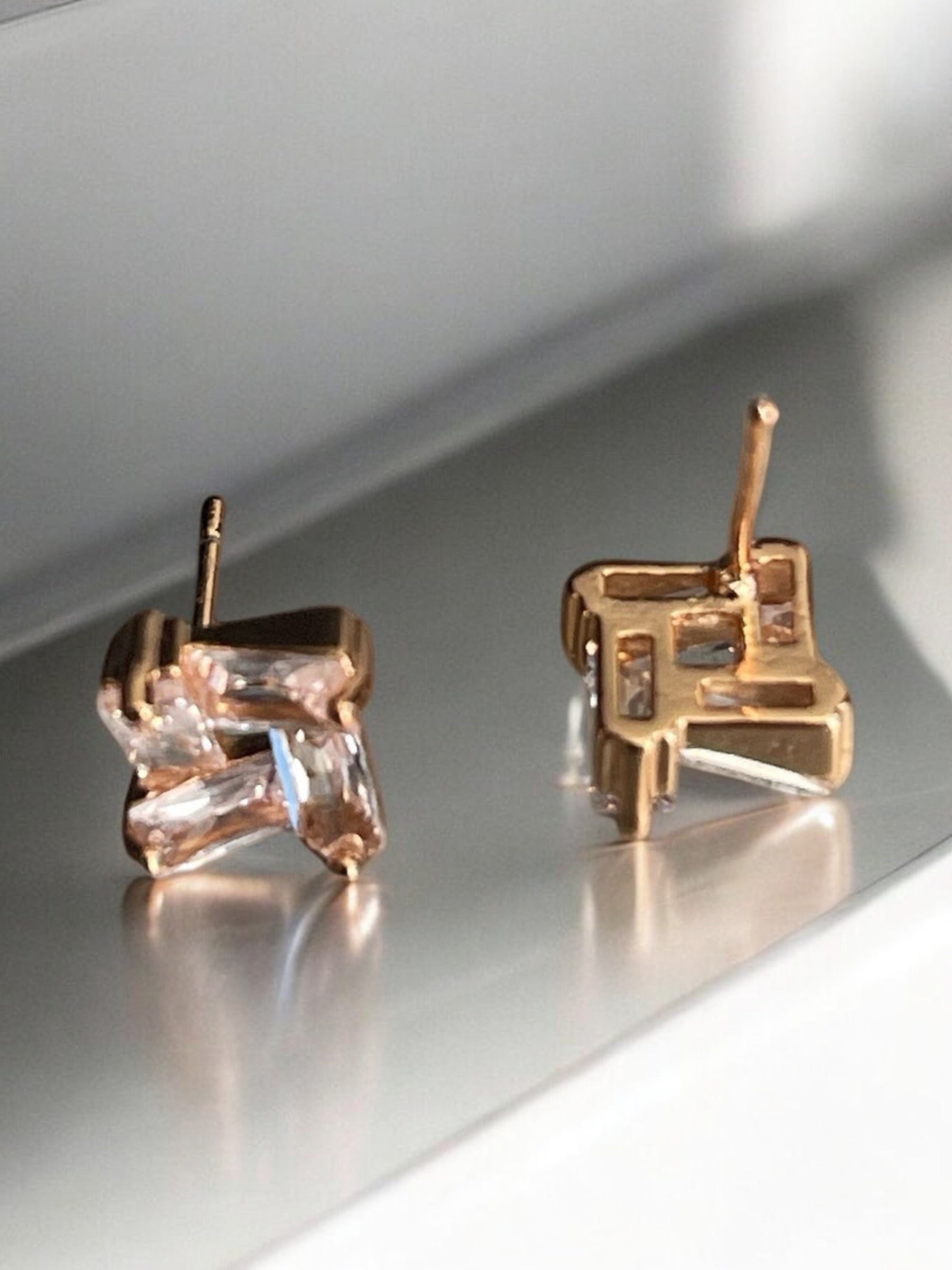 Geometric square style with cz stones post back stud earrings.